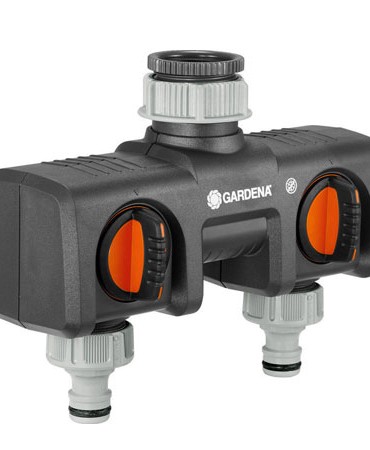 Με τη Διπλή Παροχή μπορείτε να συνδέσετε ταυτόχρονα δύο εξαρτήματα στη βρύση, όπως π.χ. δύο Προγραμματιστές Ποτίσματος. Η κάθε έξοδος διαθέτει ανεξάρτητη βάνα.